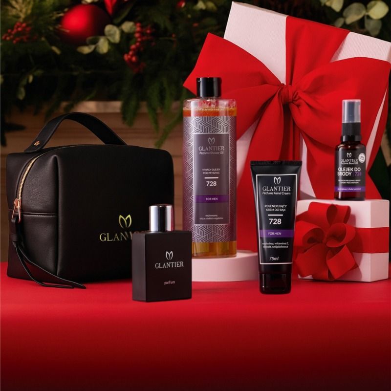 Úvod Kozmetika Kozmetické sadyGlantier Exclusive Premium 728 Parfum pánsky 50ml + Krém na ruky 75 ml + Sprchový olej 400 ml + Olej na bradu a fúzy 30 ml + kozmetická taška darčeková sada