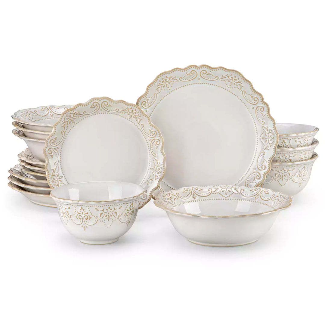 Súprava riadu Giselle 16 ks vyniká jemne reliéfnym okrajom inšpirovaným čipkou v teplých odtieňoch hnedej a béžovej, doplneným ručne nanášanou reaktívnou glazúrou vo vintage bielej a hviezdnej modrej, ktorá dodáva každému stolovaniu nádych francúzskeho šarmu.